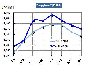 프로필렌 가격은 2월25일 FOB Korea 톤당 1330달러로 23달러 하락했다. 다만, 나프타(Naphtha) 가격이 상승을 지속하고 있어 1300달러가 무너질 가능성은 낮아지고 있다. 표, 그래프: < Propylene 가격추이 > <화학저널 2012/02/28> |