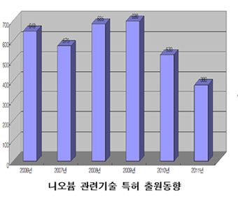 최근 신소재 기술경쟁이 치열해지는 가운데 희소금속인 니오븀(Niobium)에 대한 특허출원이 증가하고 있다. 표, 그래프: < 니오븀 관련기술 특허 출원동향 > <화학저널 2012/02/28> |