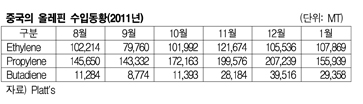 중국의 올레핀(Olefin) 수입이 1월 다시 감소세로 돌아섰다. 부타디엔(Butadiene) 수입은 10월 1만1393톤에서 11월 2만8184톤으로 늘어났고 12월에는 3만9516톤으로 최고기록을 갱신했으나 1월 2만9358만톤으로 30% 가량 떨어졌다. 표, 그래프: < 중국의 올레핀 수입동향(2011) > <화학저널 2012/02/28> |