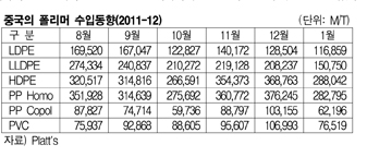 표, 그래프: < 중국의 폴리머 수입동향(2011-12) >