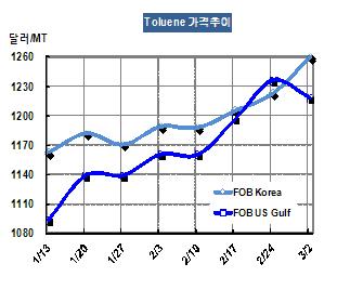 톨루엔 가격은 3월3일 FOB Korea 톤당 1260달러로 37달러 상승했다. 이에 따라 4월 및 5월 공급물량은 FOB 1250-1260달러에 거래되고 있다. 표, 그래프: < Toluene 가격추이 > <화학저널 2012/03/07> |