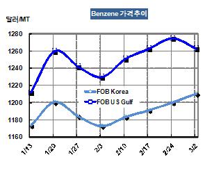 벤젠 가격은 3월3일 FOB Korea 톤당 1210달러로 10달러 상승했다. 그러나 나프타(Naphtha) 가격이 CFR Japan 톤당 1088달러로 상승함으로써 벤젠-나프타 가격 스프레드가 톤당 132.5달러에서 122.5달러로 좁혀져 수익성이 악화되고 있다. 표, 그래프: < Benzene 가격추이 > <화학저널 2012/03/08> |