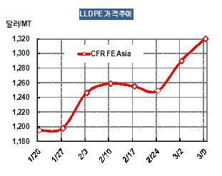 LLDPE 가격은 3월7일 CFR FE Asia 톤당 1320달러로 30달러 상승했다. 중국에서는 CNPC(China National Petroleum & Chemical)가 동부지역 내수가격을 ex-works 톤당 1만150위안(1294달러)으로 300위안(47달러) 올린 후 3-4일만에 1만450위안(1332달러)로 300위안 추가 인상했다. 표, 그래프: < LLDPE 가격추이 > <화학저널 2012/03/12> |
