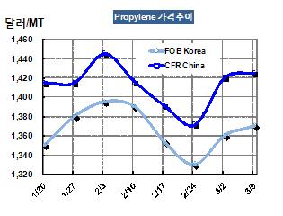 프로필렌 가격은 3월9일 FOB Korea 톤당 1370달러로 10달러 상승했다. 그러나 실수요기업들이 거래에 나서지 않은 상태에서 무역상을 중심으로 상승세를 이끌어 허수거래에 따른 조작으로 의심받고 있다. 표, 그래프: < Propylene 가격추이 > <화학저널 2012/03/13> |