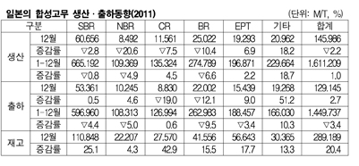 2011년 일본의 합성고무 출하량이 지진과 엔고의 영향으로 감소했다.