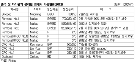 중국 및 타이완 올레핀(Olefin) 시장이 풀가동 수준을 유지하고 있다. CPC는 Kaohsiung 소재 에틸렌 50만톤 및 프로필렌 25만톤의 No.5 크래커를 90% 이상 가동하고 있는 가운데 Lin Yuan 소재 No.4 크래커는 12월 시작된 정기보수로 가동을 중단하고 있다. 표, 그래프: < 중국 및 타이완의 올레핀 크래커 가동현황(2012) > <화학저널 2012/03/14> |