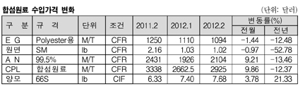 반면, AN(Acrylonitrile) 수입가격은 2월 정기보수에 따라 공급이 감소해 수급타이트로 전환된 영향으로 CFR 톤당 2104달러로 9.2% 급등했다.