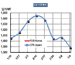 O-X 가격이 3월9일 FOB Korea 톤당 1588달러로 18달러 하락했다. China National Petroleum & Chemical(CNPC)와 Sinopec도 중국 동부지역의 O-X 공급가격을 3.3% 인하했다. 표, 그래프: < O-X 가격추이 > <화학저널 2012/03/16> |