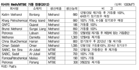 동남아와 중동의 메탄올(Methannol)과 MTBE(Methyl Tertiary-Butyl Ether) 플랜트 가동률이 높아 공급과잉이 우려된다. 한편, SABIC Sadaf는 Al-Jubail 소재 MTBE 30만톤 플랜트를, Petronas는 Pahang 소재 30만톤 플랜트를 3월22일 재가동하는 등 MTBE 가동률 역시 비교적 활발한 것으로 나타났다. <이창선 기자> 표, 그래프: < 아시아 Meth/MTBE 가동 현황(2012) > <화학저널 2012/03/16> |