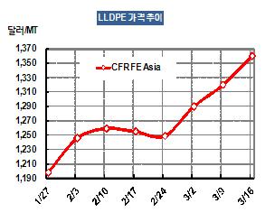 LLDPE 가격은 3월15일 CFR FE Asia 톤당 1360달러로 40달러 급등했다.