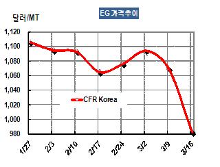 MEG 가격은 3월17일 CFR China 톤당 982달러로 87달러 폭락했다. 중국은 MEG 저장탱크가 가득 차 더 이상 구매할 수 없는 지경에 이르러 저가 판매에 나선 있는 것으로 알려졌다. 표, 그래프: < EG 가격추이 > <화학저널 2012/03/19> |