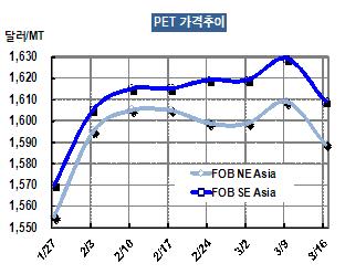 아시아 PET(Polyethylene Terephthalate) Bottle 그레이드 칩 가격이 3월14일 FOB NE Asia 톤당 1589달러로 20달러 하락했다. 아시아 PET 시장은 업스트림인 P-X(Para-Xylene) 급락에 따라 약세를 보이고 있는데, P-X는 CFR China 톤당 1665달러에서 1634달러로 톤당 31달러 하락했다 . 표, 그래프: < PET 가격추이 > <화학저널 2012/03/22> |