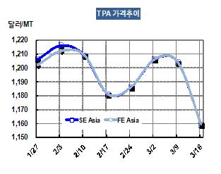 아시아 PTA(Purified Terephthalic Acid) 가격이 CFR China 톤당 1159달러로 47달러 급락했다. 중국 폴리에스터(Polyester) 섬유 가격이 지속적으로 하락해 폴리에스터 생산-판매 비율이 3월 둘째 주 80%에 미치지 못하는 60-70% 수준에 머물렀기 때문이다. 표, 그래프: < TPA 가격추이 > <화학저널 2012/03/22> |