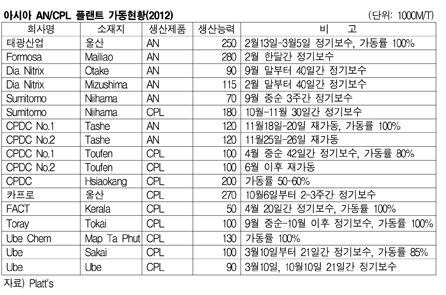 아시아 CPL(Caprolactam) 시장의 공급과잉이 완화되고 있다. 반면, AN(Acrylonitrile)은 수급타이트에서 벗어나 차츰 균형을 맞추어가고 있다. 표, 그래프: < 아시아 AN/CPL 플랜트 가동현황(2012) > <화학저널 2012/03/23> |