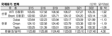 3월22일 121.99달러로 1.10달러 떨어져 … WTIㆍ브렌트유 모두 급락