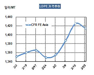 LDPE 가격은 3월21일 CFR FE Asia 톤당 1415달러로 10달러 하락했다.