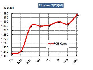 에틸렌 가격은 3월23일 FOB Korea 톤당 1385달러로 40달러 급등했다. 표, 그래프: < Ethylene 가격추이 > <화학저널 2012/03/26> |