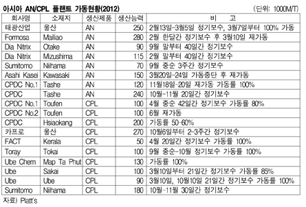 아시아 AN(Acrylonitrile) 시장의 수급타이트가 해소될 것으로 예상된다. 반면, CPL(Caprolactam) 시장은 공급과잉을 우려해 가동률을 계속 조정하고 있다. 표, 그래프: < 아시아 AN/CPL 플랜트 가동현황(2012) > <화학저널 2012/03/27> |