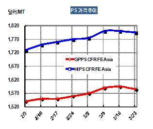 GPPS 가격은 3월21일 CFR China 톤당 1585달러로 10달러 하락했다. 중국의 SM 내수가격은 동부지역 기준 톤당 1만550-1만600위안으로 수입가격 기준 1405달러를 형성해 CFR China 1469.5달러보다 64.5달러 밑돌았다. 표, 그래프: < PS 가격추이 > <화학저널 2012/03/28> |
