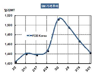 SM 가격은 3월23일 FOB Korea 톤당 1443달러로 24달러 하락했다. 국제유가 및 나프타(Naphtha) 가격이 1/4분기에 강세를 나타낸 후 2/4분기에 약세로 돌아선 2009년과 2010년 상황과 비슷하게 진행되고 있는 것도 약세 요인으로 지적되고 있다. 표, 그래프: < SM 가격추이 > <화학저널 2012/03/28> |