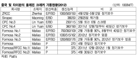 중국 및 타이완 올레핀(Olefin) 시장의 가동률 과잉양상이 지속될 것으로 예상된다. 2012년 No.3 크래커와 함께 에틸렌 103만톤, 프로필렌 51만5000톤, 부타디엔 16만2000톤의 No.2 크래커는 정기보수를 하지 않을 방침으로 No.1 크래커만 8월 40일간의 정기보수가 예정돼 있다. 표, 그래프: < 중국 및 타이완의 올레핀 크레커 가동현황(2012) > <화학저널 2012/03/29> |