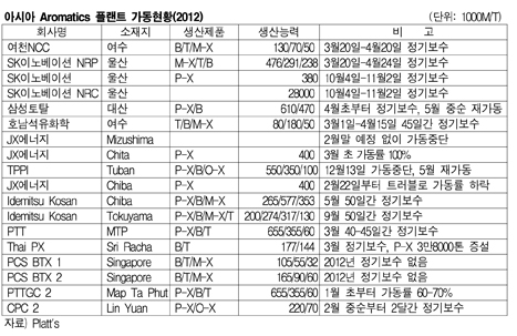 국내 아로마틱(Aromatics) 플랜트가 3-4월 줄줄이 정기보수를 실시한다. 해외에서는 PTT가 P-X 65만5000톤, 벤젠 35만5000톤, 톨루엔 6만톤 플랜트를 3월부터 40-45일 일정으로 정기보수하고 있고, Thai PX는 Sri Racha 소재 벤젠 17만7000톤, 톨루엔 14만4000톤 플랜트를 3월 2주간 정기보수하면서 P-X 3만8000톤을 증설했다. <이창선 기자> 표, 그래프: < 아시아 Aromatics 플랜트 가동현황(2012) > <화학저널 2012/03/29> |