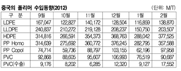 중국의 PVC 수입이 다시 증가세로 전환되고 있는 것으로 나타났다. PE(Polyethylene0 수입도 마찬가지로 LDPE(Low-Density PE)는 2011년 9월 16만톤을 넘었으나 이후 계속 부진했고 2월 14만톤 수준을 회복했다. 표, 그래프: < 중국의 폴리머 수입동향(2012) > <화학저널 2012/03/29> |