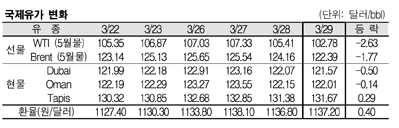 3월29일 국제유가는 사우디의 추가증산 가능성 제기, 미국 및 유럽의 전략비축유 방출 논의 진전 영향으로 하락했다. 3월29일에는 사우디의 원유 추가증산 가능성이 제기되면서 국제유가 하락요인으로 작용했다. 표, 그래프: < 국제유가 변화 > <화학저널 2012/03/30> |