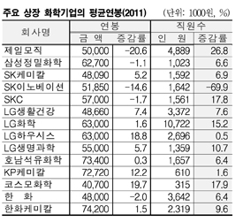 10대 그룹 상장 화학기업 중 직원 평균연봉이 가장 높은 곳은 한화케미칼로 7420만원을 기록했다. 표, 그래프: < 주요 상장 화학기업의 평균연봉(2011) > <화학저널 2012/04/02> |