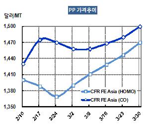 PP 가격은 3월29일 CFR FE Asia 톤당 1470달러로 23달러 상승했다. 더군다나 3월 말에는 1460달러로 폭등해 원료코스트 부담이 가중되고 있으며, 실질적으로 톤당 100달러 이상 적자를 기록하고 있다. 표, 그래프: < PP 가격추이 > <화학저널 2012/04/03> |