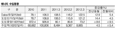 3월 화학제품 수입은 증가세를 지속했다. 미국산 수입은 FTA(자유무역협정) 체결에 따라 수입관세가 철폐되거나 낮아져 수입선 전환효과가 나타나면서 가죽ㆍ모피(20.9%), 의약품을 비롯한 정밀화학제품(50.6%)이 늘었다. 표, 그래프: < 에너지 수입동향 > <화학저널 2012/04/03> |