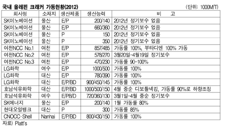 한편, 여천NCC는 No.1 에틸렌 85만7000톤 및 프로필렌 48만45000톤 크래커에서 트러블이 발생해 가동률을 70%로 낮춘 것으로 알려졌으나, 트러블이 발생하지 않았고 현재 100% 가동하고 있다고 밝혔다.