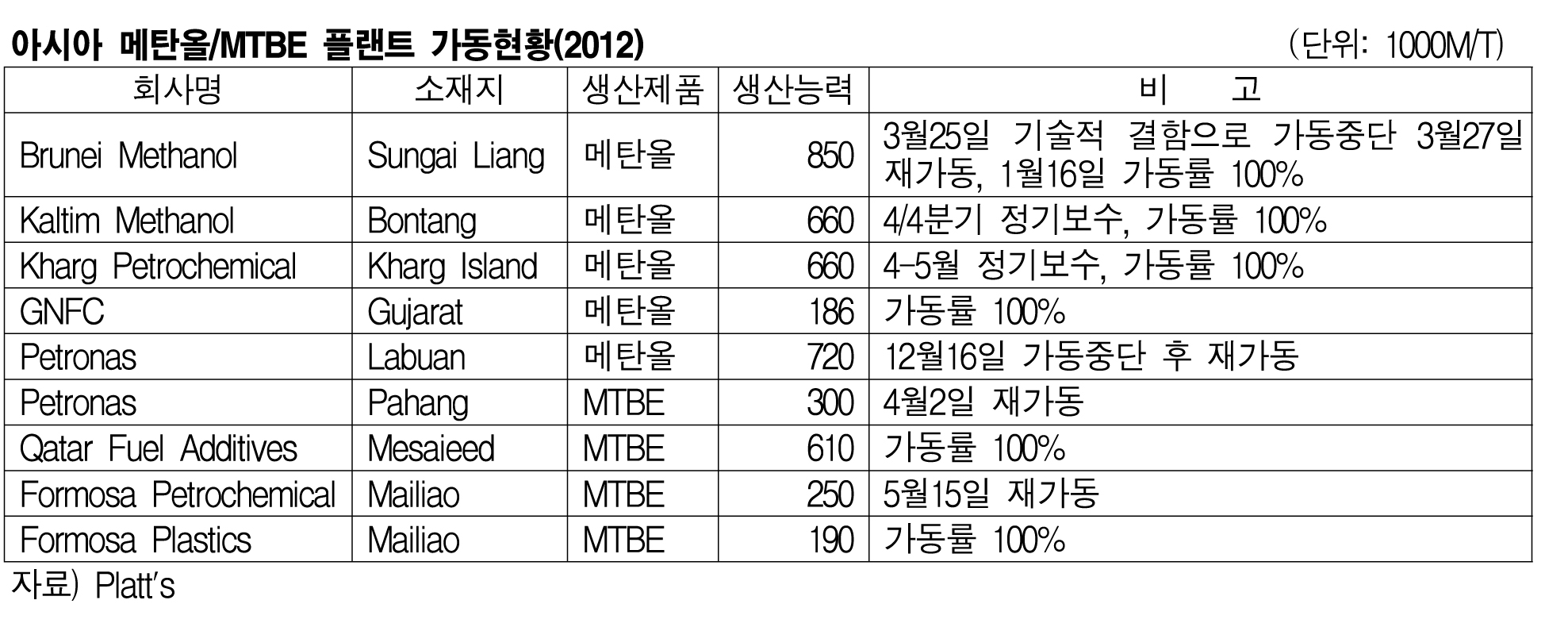 아시아 메탄올(Methanol) 및 MTBE(Methyl tert-Butyl Ether) 시장이 풀가동으로 원활한 공급을 보이고 있다. 한편, MTBE 시장도 풀가동을 하고 있거나 상반기 재가동을 앞두고 있다. 표, 그래프: < 아시아 메탄올/MTBE 플랜트 가동현황(2012) > <화학저널 2012/04/06> |