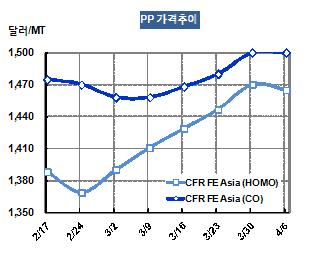 PP 가격은 4월5일 CFR FE Asia 톤당 1465달러로 5달러 하락했다.