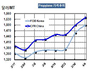 프로필렌 가격은 4월7일 FOB Korea 톤당 1500달러로 40달러 상승했다. 다만, 에틸렌(Ethylene) 가격이 1400달러에 미치지 못한 영향으로 스팀 크래커들의 가동률이 낮아 당분간 프로필렌 수급타이트가 지속될 것으로 예상된다. 표, 그래프: < Propylene 가격추이 > <화학저널 2012/04/10> |