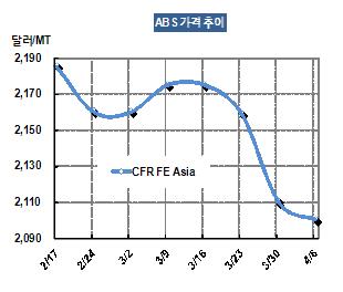ABS 가격은 4월5일 CFR FE Asia 톤당 2100달러로 10달러 하락했다.