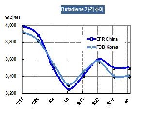 부타디엔 가격은 4월7일 FOB Korea 톤당 3400달러로 보합세를 형성했다. 동북아시아에서는 CFR 3300달러에서 3600달러까지 공급-구매 양쪽의 요구수준에 300달러 차이가 있는 것으로 알려졌다. 표, 그래프: < Butadiene 가격추이 > <화학저널 2012/04/12> |