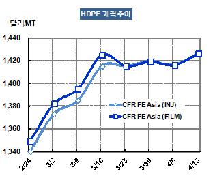 HDPE 가격은 4월11일 CFR FE Asia 톤당 1426달러로 10달러 상승했다.