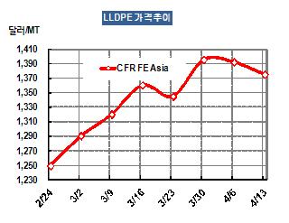 LLDPE 가격은 4월11일 CFR FE Asia 톤당 1375달러로 17달러 하락했다. 동북아시아는 중국이 3일 동안 휴무한 이후 수급밸런스가 무너져 공급과잉으로 전환되는 양상을 보이고 있다. 표, 그래프: < LLDPE 가격추이 > <화학저널 2012/04/16> |