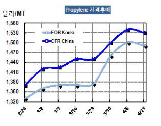 프로필렌 가격은 4월13일 FOB Korea 톤당 1490달러로 10달러 하락했다.