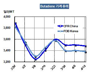 부타디엔 가격은 4월13일 FOB Korea 톤당 3380달러로 20달러 하락했다. 이란산 4000톤은 CFR 톤당 3450-3500달러에 판매를 기다리고 있다. 표, 그래프: < Butadiene 가격추이 > <화학저널 2012/04/17> |
