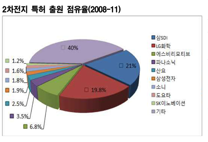 최근 배터리의 중량과 순간파워 및 지속시간 등을 크게 개선한 대용량, 고효율의 전지기술이 개발됨으로써 하이브리드ㆍ전기자동차에 활용되는 2차전지 관련 기술특허 출원이 급증하고 있다. 표, 그래프: < 2차전지 특허 출원 점유율(2008-11) > <화학저널 2012/04/18> |