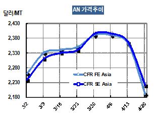 아시아 AN(Acrylonitrile) 가격이 CFR FE Asia 톤당 2190달러로 170달러 폭락했다. 이에 따라 계절적 비수기가 끝나는 7-8월까지 앞으로 3-4개월 동안 가격 하락세가 지속될 가능성이 제기되고 있다. 표, 그래프: < AN 가격추이 > <화학저널 2012/04/26> |