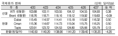 한국석유공사에 따르면, 4월27일 뉴욕상업거래소(NYMEX)의 WTI(서부텍사스 경질유) 선물유가는 배럴당 0.38달러 상승해 104.93달러를 기록한 반면, 런던석유거래소(ICE)의 북해산 브렌트(Brent)유는 0.09달러 떨어져 119.83달러에 거래를 마감했다.