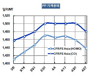 PP 가격은 4월25일 CFR FE Asia 톤당 1438달러로 20달러 하락했다. 경제의 불확실성이 해소되지 않으면서 PP 가공제품 수요가 줄어들고 있기 때문으로, 유통상들은 90일 신용거래 기준으로 ex-warehouse 톤당 1420달러로 낮추어 오퍼했다. <화학저널 2012/05/02> |