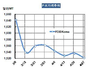 P-X 가격은 4월27일 FOB Korea 톤당 1522달러로 15달러 하락했다. 중국의 폴리에스터 생산-판매 비율은 한때 200-400%에 달한 것으로 알려졌으나 아직도 재고가 상당한 것으로 알려져 유통상들이 조작했거나 허위사실을 유포한 것으로 판단된다. 표, 그래프: < P-X 가격추이 > <화학저널 2012/05/03> |