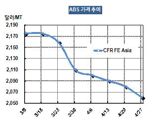 ABS 가격은 4월25일 CFR FE Asia 톤당 2060달러로 20달러 하락했다. 타이완의 ABS 생산기업이 CFR China 톤당 2075달러를 요구했으나 바이어들은 너무 비싸다며 구매를 거부한 것으로 알려졌다. 표, 그래프: < ABS 가격추이 > <화학저널 2012/05/03> |