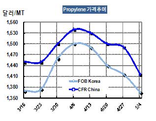 프로필렌 가격은 5월4일 FOB Korea 톤당 1365달러로 50달러 급락했다.