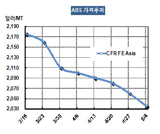 ABS 가격은 5월2일 CFR FE Asia 톤당 2035달러로 25달러 하락했다. AN(Acrylonitrile)은 CFR FE Asia 톤당 1990달러로 90달러 폭락했고, 부타디엔(Butadiene)은 CFR China 톤당 2500달러로 498달러 폭락했으며, SM(Styrene Monomer)은 1497달러로 약보합세를 나타냈다. 표, 그래프: < ABS 가격추이 > <화학저널 2012/05/09> |