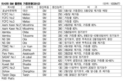 표, 그래프: < 아시아 SM 플랜트 가동현황(2012) > <화학저널 2012/05/10> |